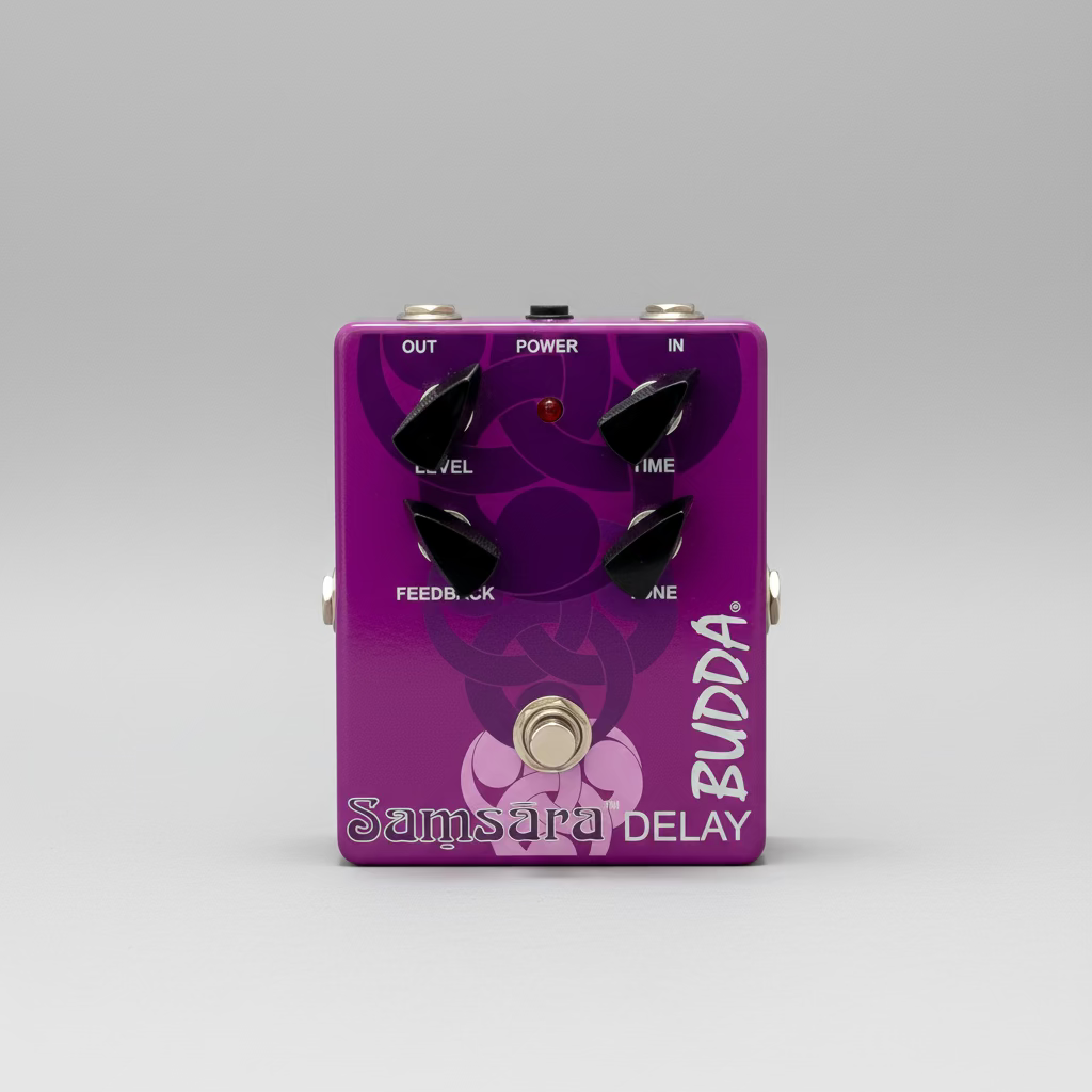 Budda Amplification, a leader in low wattage boutique amps for over 15 years, now offers the Samsara Delay pedal. It delivers up to 600 ms of delay time with vintage sound and straightforward controls. Easily adjust from subtle slapback to rich, U2-style delays. The tone control lets you shift from warm, lo-fi analog delay sounds to brighter, modern tones.