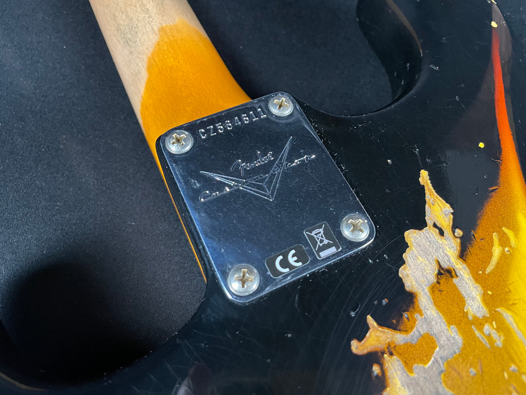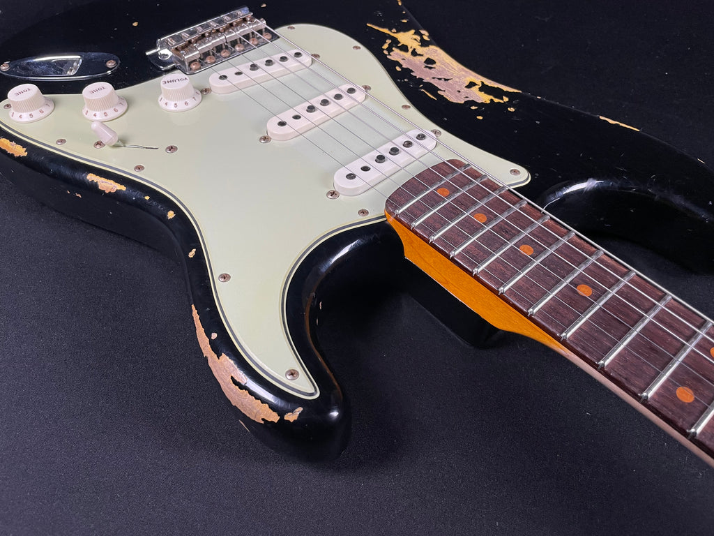 New for 2023, the Fender Custom Shop introduces the ’60 Stratocaster Heavy Relic, and believe us—it’s very aptly named. The two-piece select alder body wears Heavy Relic lacquer finishes in Aged Black over Three-Color Sunburst. This is the heaviest of the Relic treatments, with each imparting the look of a golden-era 1960 Strat that has not exactly been handled gingerly over six-plus decades. From seriously dinged and damaged wear to intensely discolored hardware and finish, this is a guitar that has been to Hell and back more than once; a guitar that has repeatedly been through the ringer and then some, laughing all the while even as it demands more punishment.