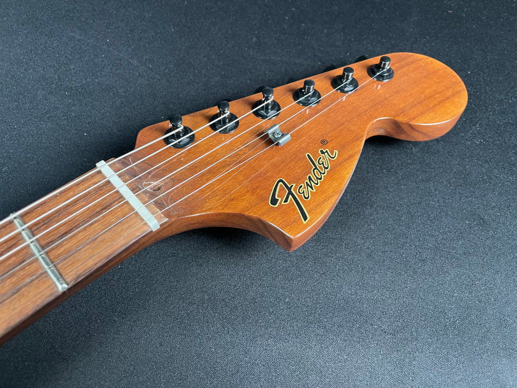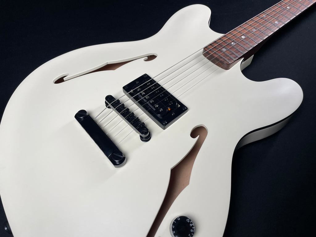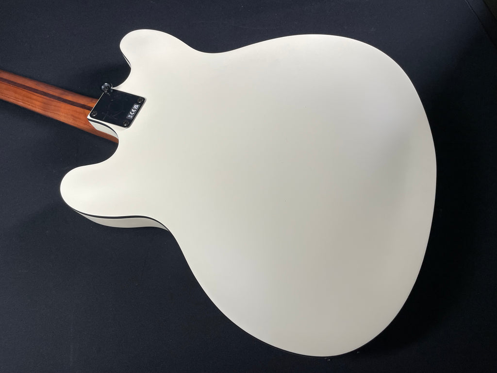 Designed with an offset semi-hollow body, the Tom DeLonge Starcaster boasts a Seymour Duncan SH-5 Duncan Custom humbucker for turbo-charged tone that’s perfect for chunky power chords and crunchy riffs. But it's not all about power — the streamlined control setup consisting of a single master volume combined with a treble bleed circuit preserves the guitar’s natural high-end, ensuring sparkly cleans and chime-y edge-of-breakup tones. The comfy modern "C" neck features medium jumbo frets on a 12"-radius rosewood fingerboard for a modern feel with superior playability. Other highlights include Fender locking tuners for rock-solid tuning stability and fully adjustable bridge with stop tailpiece for classic looks, superior setup adjustment and enhanced tuning stability. DeLonge’s original signature artwork is featured on the back of the headstock and custom crafted neck plate.