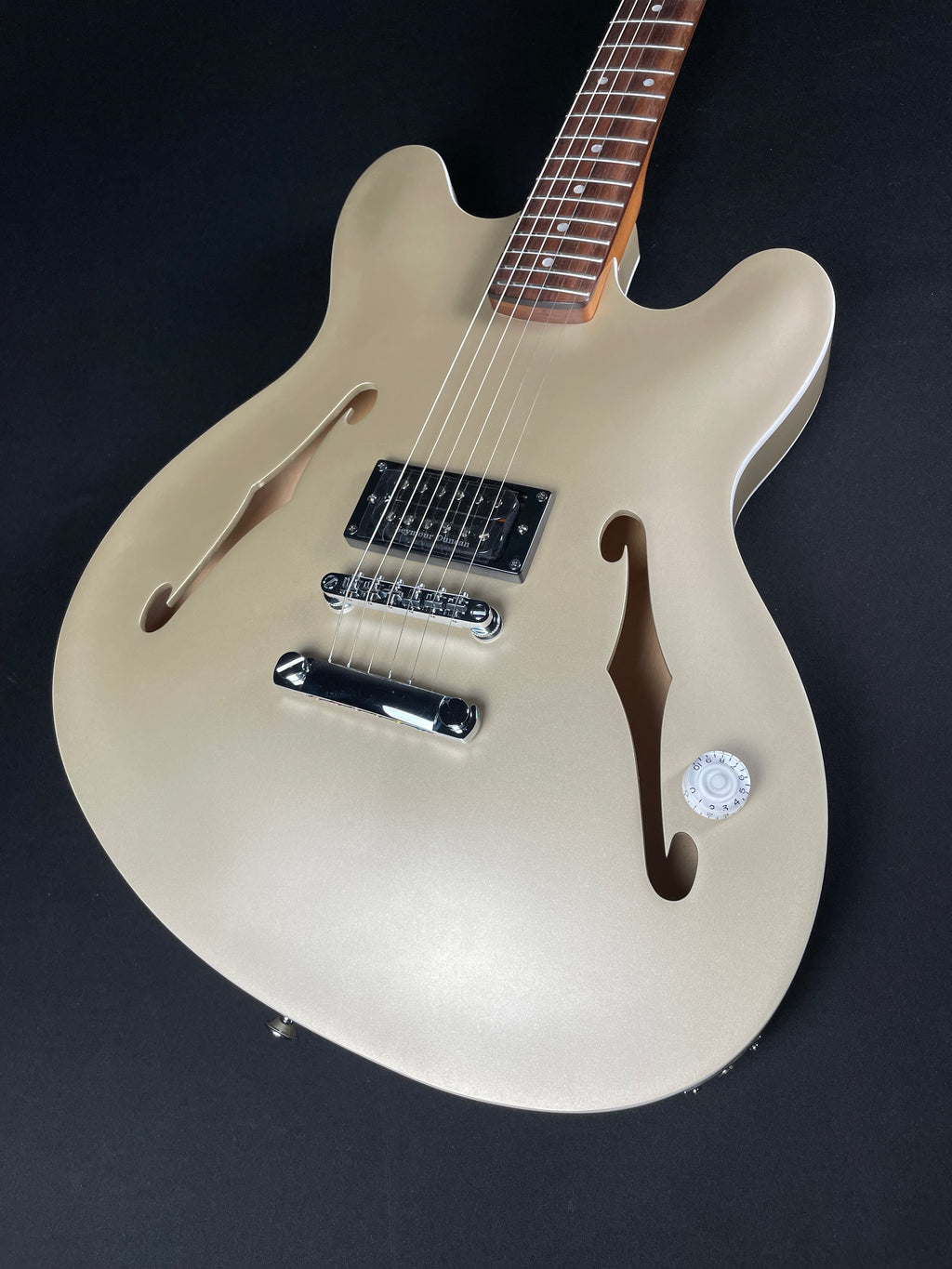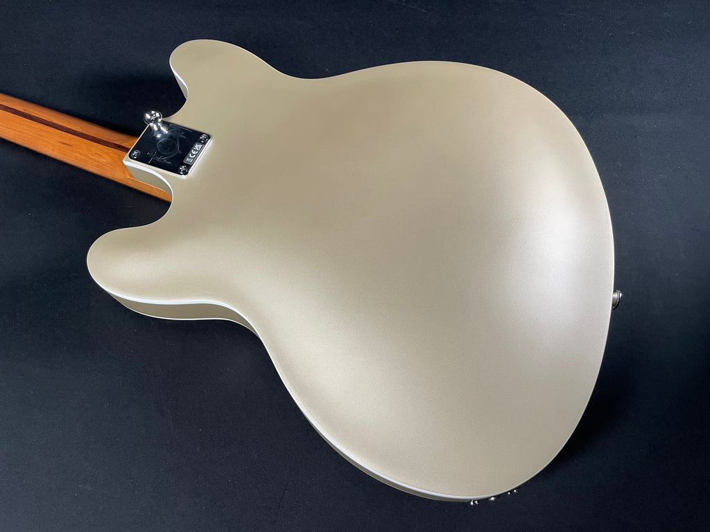 Designed with an offset semi-hollow body, the Tom DeLonge Starcaster boasts a Seymour Duncan SH-5 Duncan Custom humbucker for turbo-charged tone that’s perfect for chunky power chords and crunchy riffs. But it's not all about power — the streamlined control setup consisting of a single master volume combined with a treble bleed circuit preserves the guitar’s natural high-end, ensuring sparkly cleans and chime-y edge-of-breakup tones. The comfy modern "C" neck features medium jumbo frets on a 12"-radius rosewood fingerboard for a modern feel with superior playability. Other highlights include Fender locking tuners for rock-solid tuning stability and fully adjustable bridge with stop tailpiece for classic looks, superior setup adjustment and enhanced tuning stability. DeLonge’s original signature artwork is featured on the back of the headstock and custom crafted neck plate.