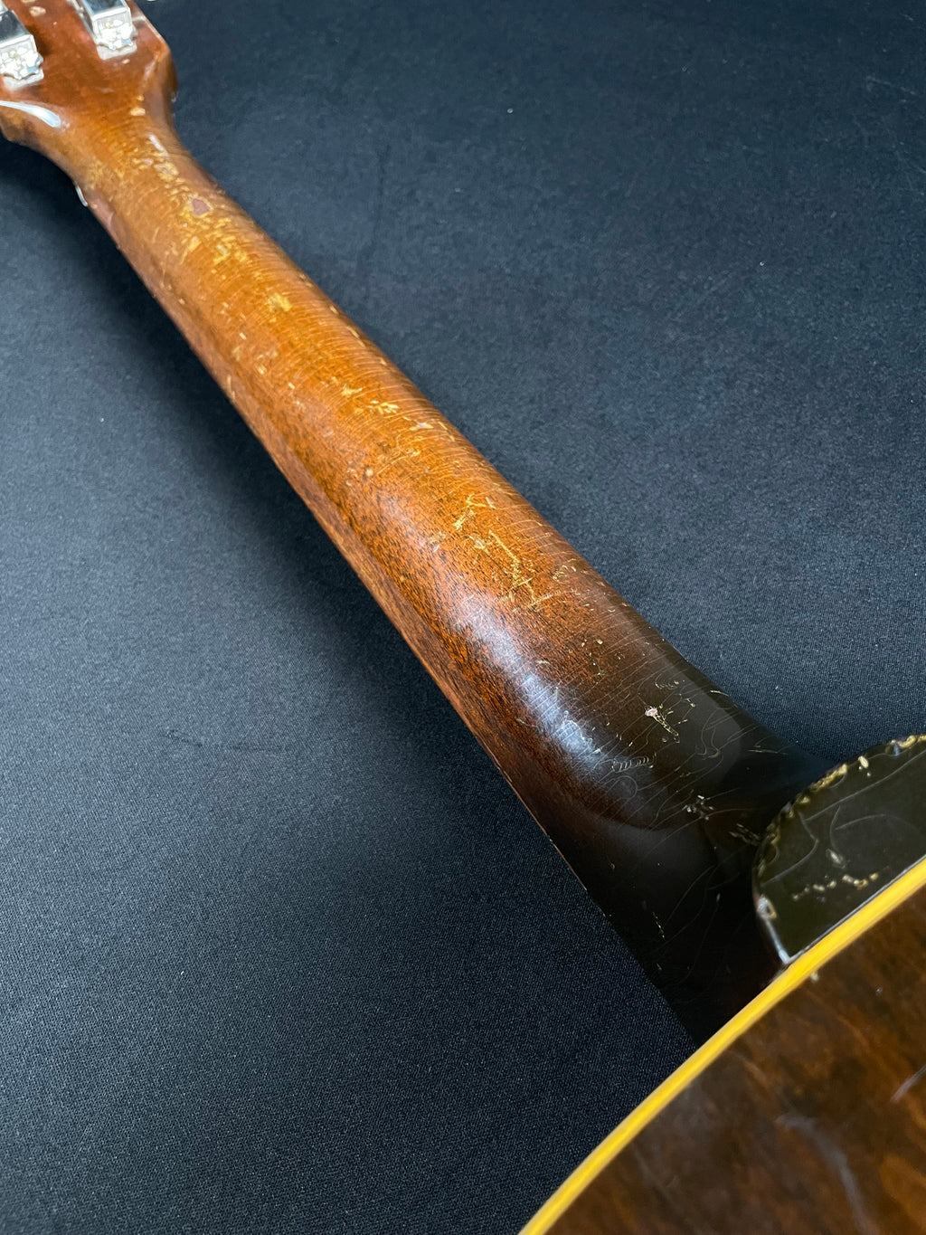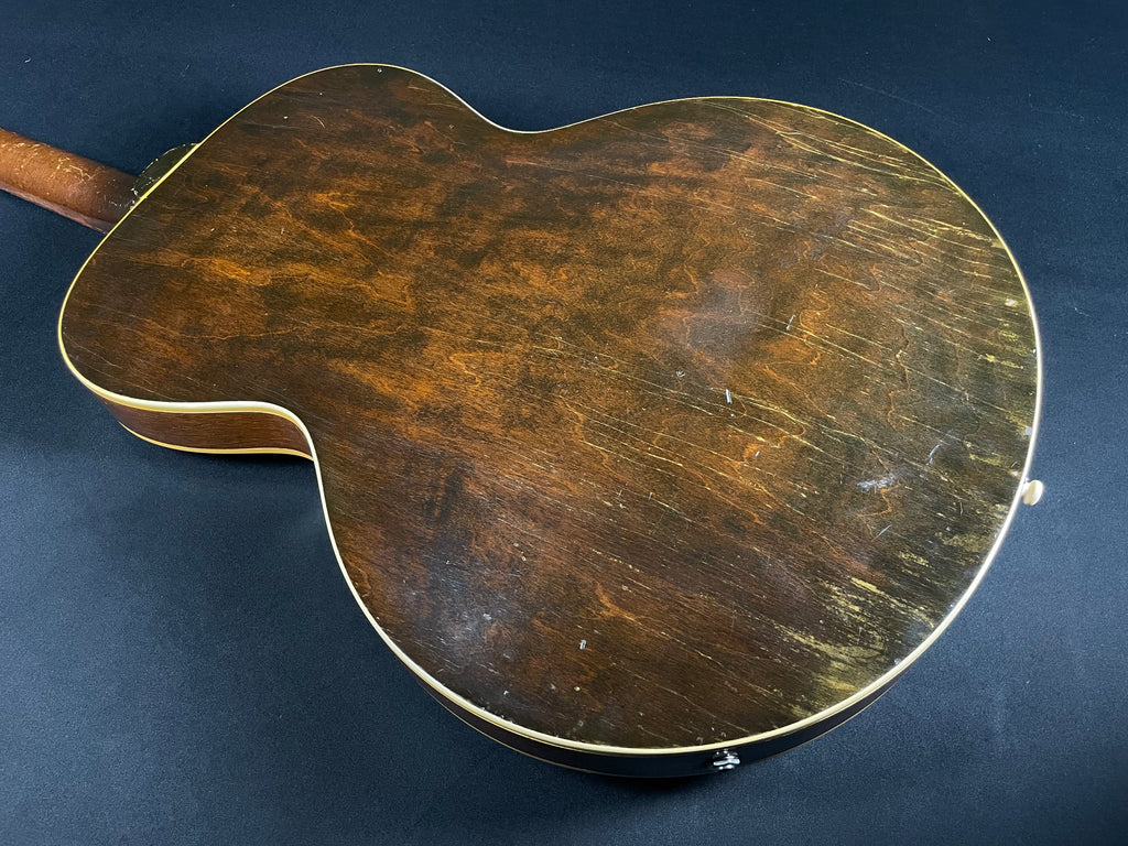 This Gibson ES-125T was manufactured in 1957 and is in very good condition overall, The sunburst top and dark stained back and sides have visible wear and checking but most of the finish is intact. The tuning machines have been replaced. The frets are original and only show minor wear and have tons of material left to work with. The pickup is original but the electronics have been replaced with period correct components. A non-original hardcase is included.