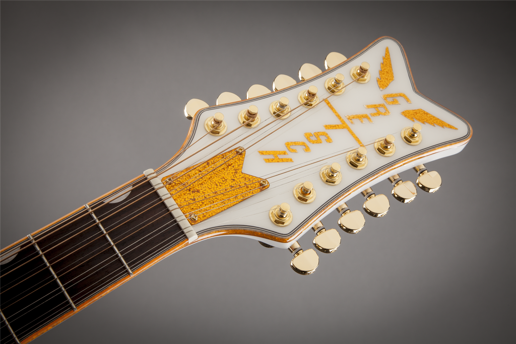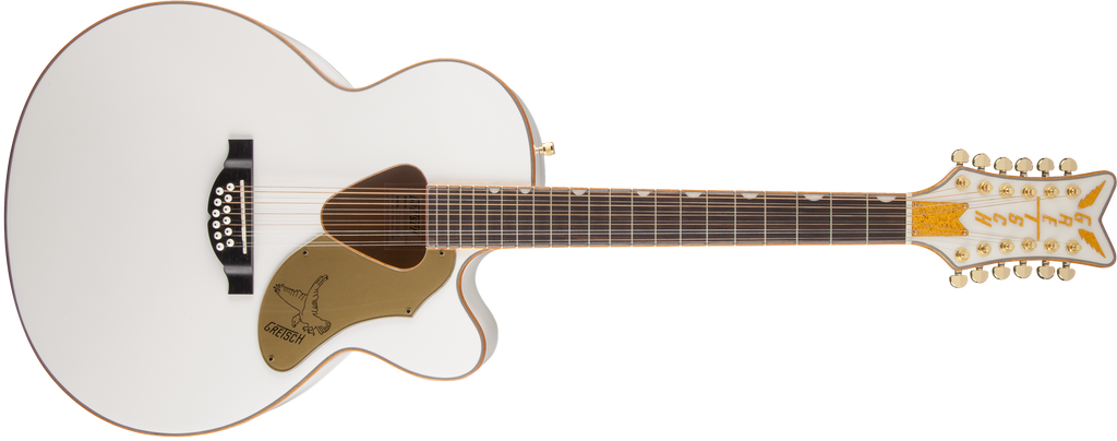 Its jumbo cutaway body includes dazzling gold-sparkle binding on the top, back, sound hole, fingerboard and headstock. Other premium features include a solid spruce top with scalloped "X"-bracing and classic Rancher triangular sound hole, maple sides and arched back, mahogany neck, 21-fret laurel fingerboard with Neo-Classic™ thumbnail inlays, "V"-shaped headstock with vertical winged "Gretsch" sparkle logo, compensated bridge with laurel base, deluxe tuners, and gold-plated hardware. The Fishman® Sonicore under-saddle pickup and Isys preamp system provide great amplified performance and flexible sonic control, with volume, tone and phase controls, onboard tuner and battery life indicator.