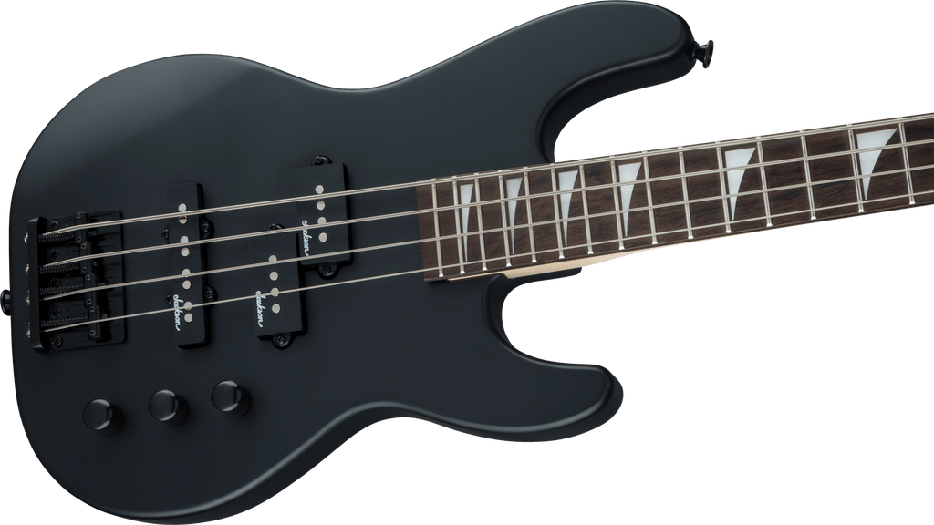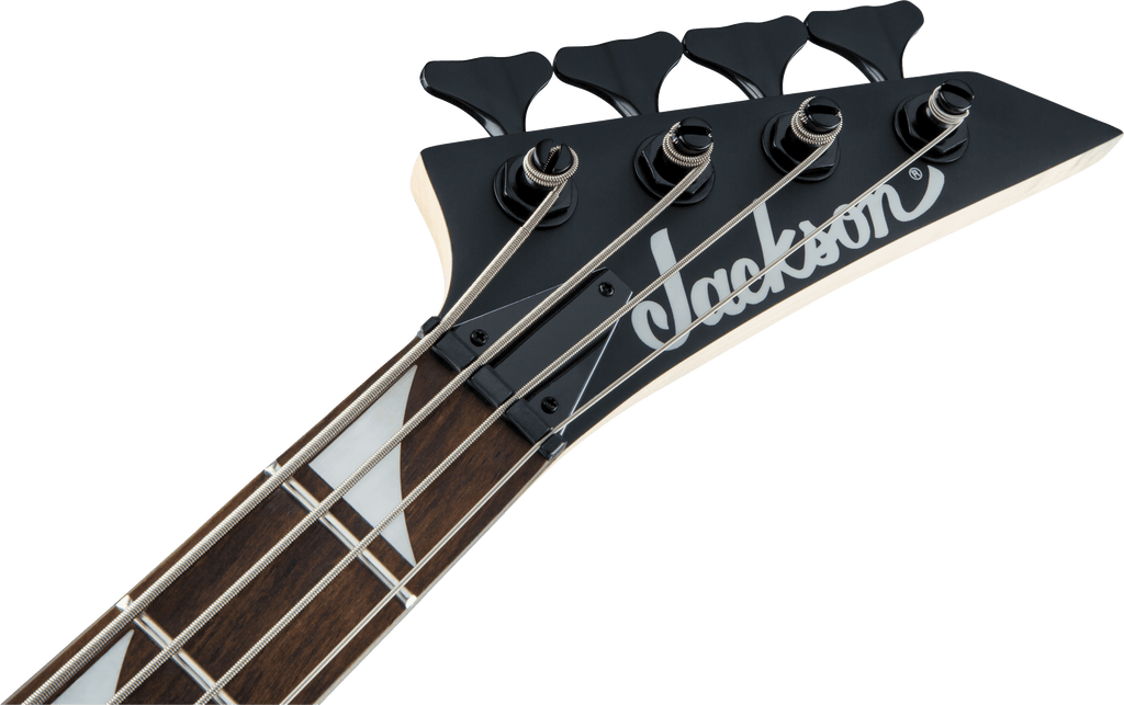 A Jackson P style neck pickup and Jackson J style bridge pickup power this 4-string bass, which also features a pair of volume knobs, single tone knob, hardtail bridge with black base plate and Jackson-branded tuners.