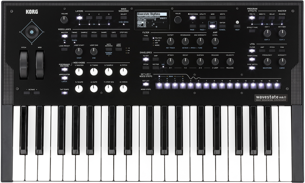 Korg’s original wavestate synth earned praise for expanding on the classic 1990 Wavestation with advanced real-time sample manipulation and synthesis features. The wavestate MKII pushes creative boundaries further by blending subtractive synthesis, groove boxes, drum machines, and algorithmic composition. It lets you save presets as Set Lists for quick access and features Smooth Sound Transitions to keep notes ringing after switching patches. Improvements include increased polyphony from 64 to 96 voices, 15 new performances, 43 additional presets, and extensive updates to hundreds of existing sounds.