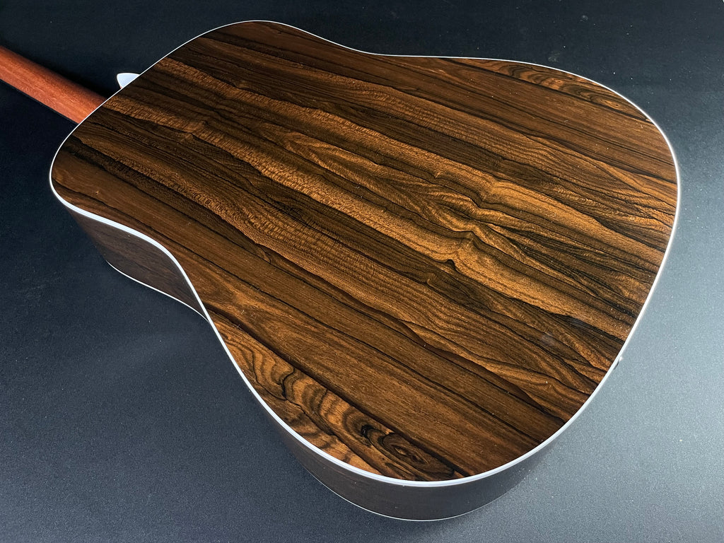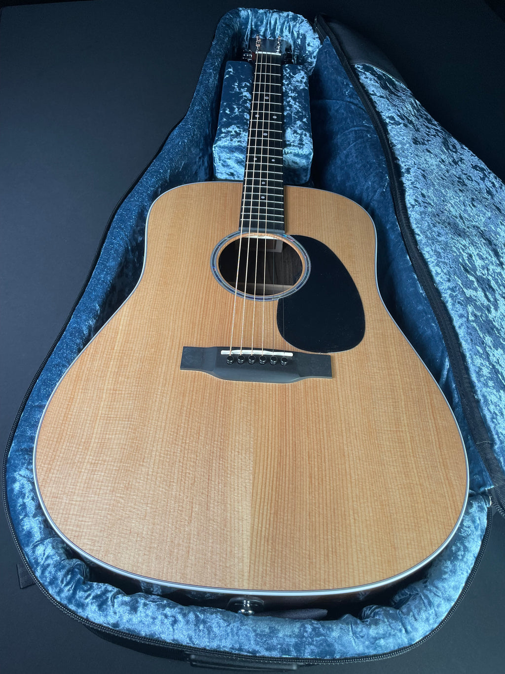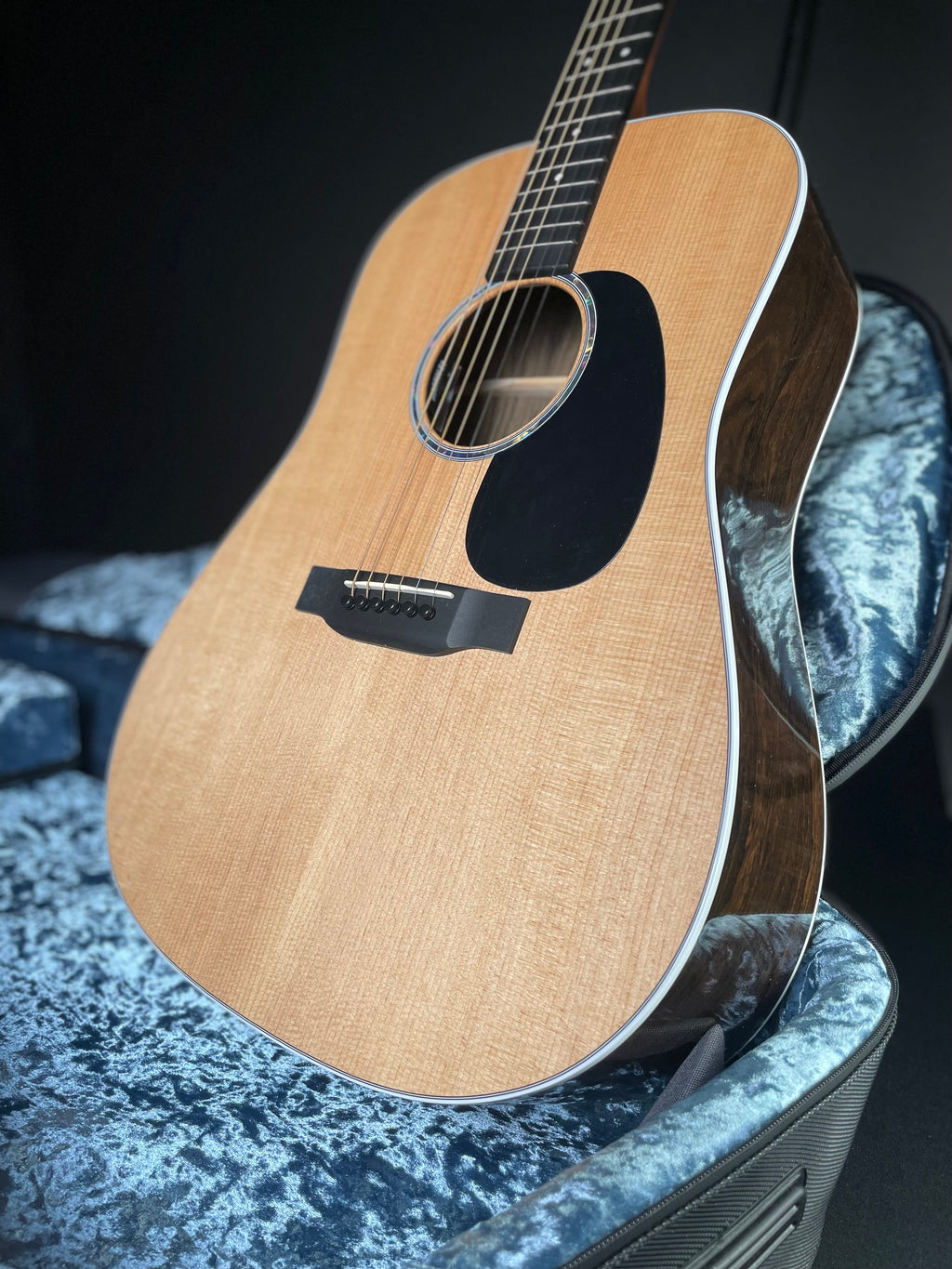 With a gorgeous glossed spruce top and ziricote fine veneer back and sides, this Dreadnought model is a great sounding guitar at an affordable price. New to this model are stunning mother-of-pearl pattern fingerboard and rosette inlays, a multi-stripe rosette border, and white binding. It has an FSC® Certified Richlite® fingerboard and bridge, gloss body, and a hand-rubbed neck finish. Also new to this model is Martin E-1 electronics with a built-in soundhole tuner so you can tune up any time without using a pedal. This guitar comes with a Premium Soft Shell Case so it is Road-ready to join you on all of your adventures!
