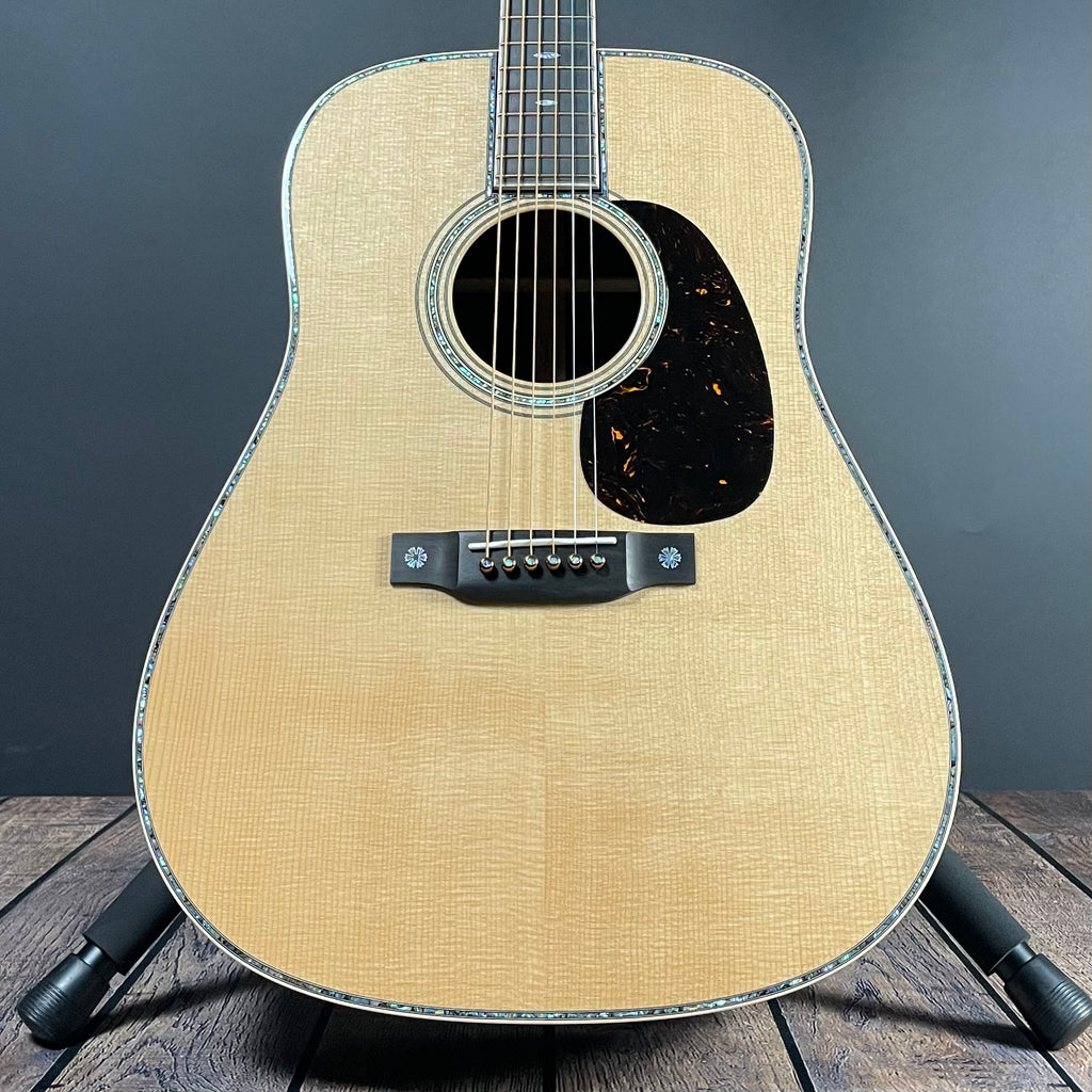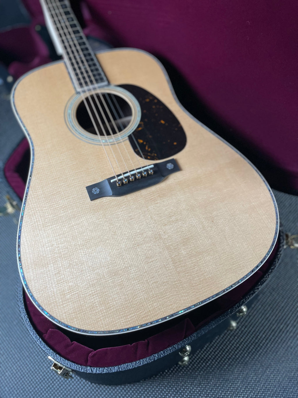 The D-42 Modern Deluxe is a new take on Martin Vintage. This guitar is packed with custom features and modern technology that you have to see, feel, and hear for yourself. The vintage appointments include a spruce VINTAGE TONE SYSTEM® (VTS) top, a dovetail neck joint, and natural protein glue construction giving it the rich, fully aged Martin tone that has inspired generations. The look is unlike anything in our production line with European flamed maple binding (on the body, fingerboard, and headplate), stylish gold frets, gold open-gear tuners, and an ornate torch logo inlaid in pearl on the headstock. Some ultra-modern features include Liquidmetal® bridge pins with abalone dots and a composite carbon fiber bridgeplate that boosts volume, and a new neck shape that is slightly asymmetrical for maximum hand comfort up and down the fretboard. This guitar is anything but standard.
